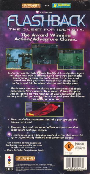 Flashback, released as Flashback: The Quest for Identity in the US, is a cinematic platformer developed by Delphine Software of France, a now defunct company, and published by U.S. Gold in United States and Europe, and Sunsoft in Japan.