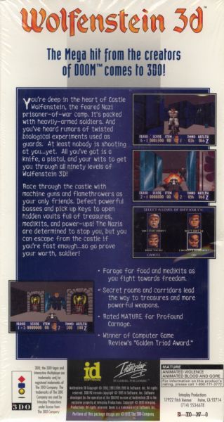 Wolfenstein 3D is a seminal first-person shooter developed by id Software and published by Apogee Software. Originally released on May 5, 1992 for DOS, the game was inspired by the 1980s Muse Software video games Castle Wolfenstein and Beyond Castle Wolfenstein. In Wolfenstein 3D, the player assumes the role of a WWII American soldier of Polish descent, William "B.J." Blazkowicz, attempting to escape from the Nazi German stronghold of Castle Wolfenstein. After the initial escape episode, the player carries out five other episodes fighting against the Nazis.