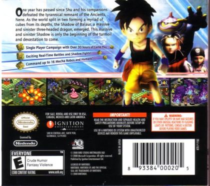 Currently a top-rated show on Cartoon Network in the U.S., the story of Blue Dragon centers on a young boy named Shu and several of his friends who possess the ability to control phantom shadows that mirror the actions of their masters. In Blue Dragon Plus, one year has passed since Shu and his companions defeated the tyrannical remnant of the Ancients, Nene. In the midst of the battle, the world split in two and now consists of a myriad of "cubes" that exploded from its depths. King Jibral notices a mysterious cube in the distance suddenly start to move violently, and from it he sees the Shadow of a Balaur, a three-headed dragon, emerge. The enormous and sinister Shadow is just the beginning of the new turmoil and devastation to come.