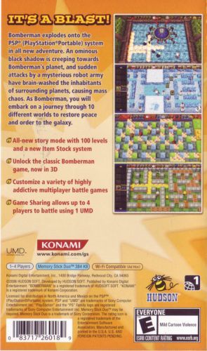 Bomberman marks the debut of the bomb-toting hero on the PSP system with classic gameplay and a wealth of new handheld gaming twists. An ominous black shadow is creeping towards Bomberman's planet, and sudden attacks by a mysterious robot army have brain-washed the inhabitants of surrounding planets, creating mass chaos. Now Bomberman must embark on an intergalactic adventure to stop this evil menace and save his planet.