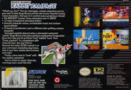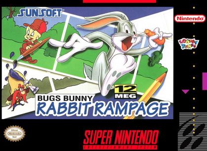 Bugs Bunny Rabbit Rampage is a side-scrolling platform game. The player, controlling Bugs Bunny, is able to jump (and squash), high-kick, throw cream pies and use ACME weapons. These weapons are scattered all over the landscape and include such cartoon favorites as bone-shaped dynamite sticks, anvils to drop on heads, Shrink Rays, portable holes and many more. Players will encounter a variety of familiar Looney Tunes characters as enemies and level bosses. At the end of each level (10 in all). players are given a rating based on their gameplay style, which includes how many of these ACME weapons they were willing to use.