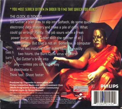 ou play data thief Sol Cutter in a very Johnny Mnemonic -like plot. You have just pulled off a major data theft, but in doing so you've infected yourself with a neural virus, named Burn:Cycle, which will literally turn your brain into goo in 2 hours. Unless, that is, you can find a cure while you simultaneously try to avoid the people whom you stole the data from.
