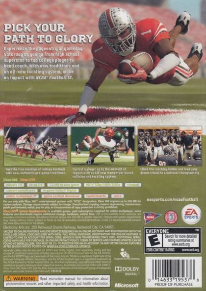 NCAA Football 12 takes the journey of the college athlete to the next level of depth and authenticity. Experience the pride and pageantry of gameday Saturday like never before as you go from high school superstar to top college player to head coach in Road to Glory and Dynasty modes. With an enhanced in-game presentation, new traditions, and an all-new collision system, make an impact by leading your team to the National Championship with NCAA Football 12.
