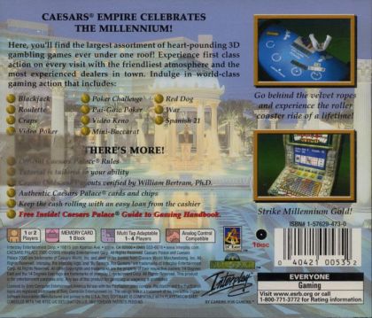 For those either too young, too broke or just not able to make the trek to Caesar's Palace in Las Vegas, Interplay's Caesar's Palace 2000 may just be the thing for you. The best thing is that you can play casino games with no financial loss to you (besides the initial investment of the game). Play a variety of games ranging from Blackjack, Paigow, Roulette, Craps, to five different versions of slot machines and more. Players should keep in mind that playing these games may not necessarily improve their own real-life skills.