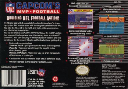 Get out on the gridiron and bust some heads with CAPCOM'S MVP FOOTBALL. Thanks to a full license by the NFL, you'll find 28 real-life NFL teams at your disposal and three modes of play that will challenge your football knowledge and skills. In Team vs. Team mode, you'll go head-to-head against your opponent; in Playoffs mode, you try to take your team to the Super Bowl; and in the MVP mode, you're dared to work your way through increasingly difficult game situations. There are 30 offensive and 25 defensive plays to choose from, meaning you'll always be able to keep your opponent on his toes. So, if you're looking for the next best thing to actually strapping on the pads and taking the field, then CAPCOM'S MVP FOOTBALL is just what you need.