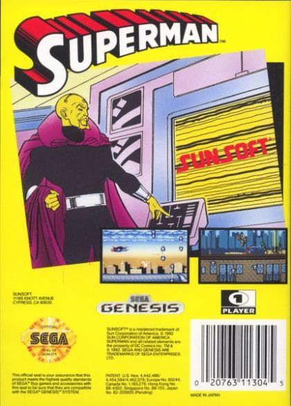 Superman is a single player, action based platformer for the Sega Genesis. As the Man of Steel, you jump, punch and kick your way through several levels, battling the likes of Prankster, Metallo, and Mr. Mxyzptlk to keep Metropolis safe. After the initial levels, the evil Brainiac kidnaps Lois Lane and takes her to his space station. Some levels take place in flight, and allow you to not only fly but shoot lasers from Superman's eyes. On the ground, you can collect icons that allow you to use a super power once, often a super punch or spin attack to remove an obstacle in the game.