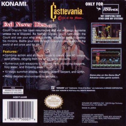 Count Dracula has been resurrected and evil will reign supreme unless he is stopped. As Nathan Graves, you'll hunt down the count and use your whip and a variety of special items to destroy his minions. Battle your way through Dracula's castle and rid the world of evil once and for all!