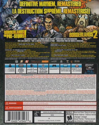 DEFINITIVE MAYHEM, REMASTERED! Borderlands: The Handsome Collection is the essential Borderlands compilation and includes the definitive versions of both Borderlands 2 and Borderlands: The Pre-Sequel, built specifically for next-gen consoles. PlayStation 4 and Xbox One customers will experience the absolute highest performance and highest fidelity graphics for any Borderlands game ever played on a video game console. For the first time in the franchise's history, play four-player split screen on a single television, all in stunning high definition.