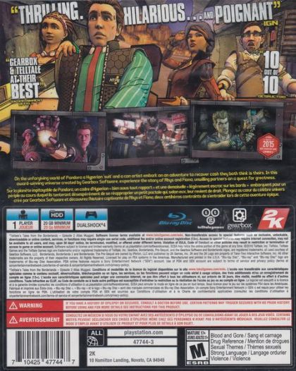 Tales from the Borderlands is an episodic graphic adventure comedy video game based on the Borderlands series, released in November 2014 for Android, iOS, Microsoft Windows, OS X, PlayStation 3, PlayStation 4, Xbox 360, and Xbox One.[1] The game was developed by Telltale Games under license from Gearbox Software, the developer of the Borderlands series, and 2K Games, its publisher. The game follows the episodic format that Telltale used for its titles The Walking Dead and The Wolf Among Us, where player choices and actions have significant effects on later story elements.