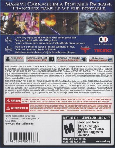 The high octane action and storyline of Ninja Gaiden Sigma are boosted with the addition of refined interface and support controls. Players can access a precise firing mode on the front panel to take aim and launch projectile weapons at enemies using the Six Axis. Further, players will be able to activate and perform powerful Ninpo attacks with the rear touch screen by tapping, painting, or swiping in accordance with onscreen indicators.