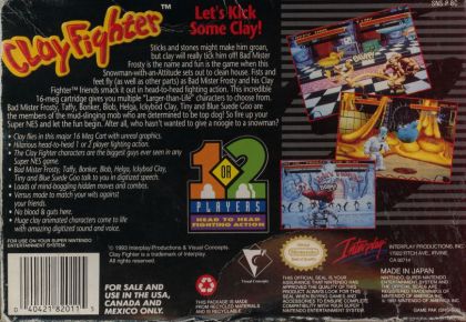 Clay Fighter is a 2D fighting game released in which the characters, as the name suggests, are made completely out of clay. This allows for interesting moves and stylized graphics. The zany roster includes: Bad Mr. Frosty, a snowman; Taffy, a piece of stretchable candy; Blob, a character who can morph into different shapes; Blue Suede Goo, an Elvis knock-off; Ickybod Clay, a pumpkin-headed ghost; Helga, an opera singer; and Bonker, the crazed clown. Each character also has their own level and individual taunts.