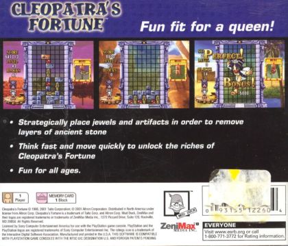 Cleopatra Fortune is a puzzle game with a difference. Line up the falling stone blocks to entomb treasure and claim it for yourself. Play through the tricky Mystery mode or simply pit your wits against a host of one-off puzzles in the challenging Versus or Time Attack modes. With colourful graphics that bring ancient Egypt on to your screen, Cleopatra Fortune offers an unmissable challenge.