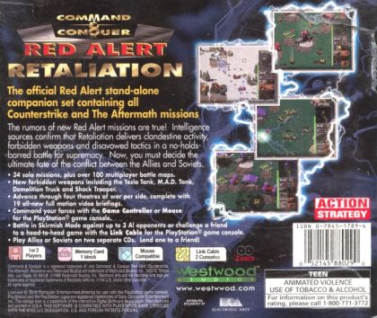 COMMAND AND CONQUER: Red Alert Retaliation brings the Counterstrike and Aftermath expansions to the PlayStation. According to historical lore, Albert Einstein went back in time and eliminated Hitler from history. Messing with the space-time continuum always has unintended consequences, and this story is no different. In the new timeline, World War II never occurred and Stalin and the Soviets expanded unchecked into Eastern Europe. Now, the Allies have formed to put a stop to Stalin and his plans. Play as either the Soviets or the Allies each with unique missions and troops, including 100 two-player missions (link-cable required) and seven new units. Since each side has different advantages and disadvantages, varied strategies and thinking are required to be successful. In general, missions consist of establishing and defending a base, gathering resources, and destroying the enemy base. Take over Europe or defend it; the choice is yours in COMMAND AND CONQUER: Red Alert Retaliation.