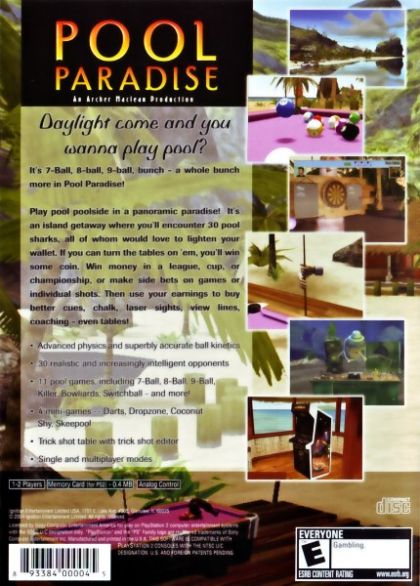 Pool Paradise lets players experience playing pool in exotic locations in the South Pacific. There are 30 different computer opponents to compete against as well as 10 different table designs to play on. There are 11 different rule types to compete in and 10 different tournaments to compete in. There are five different modes to play in including Practice, Championship, Tournament, Trick Shots and a series of mini-games such as playing a game of darts on the beach, skee ball with cue balls and even shooting coconuts out of a cannon.