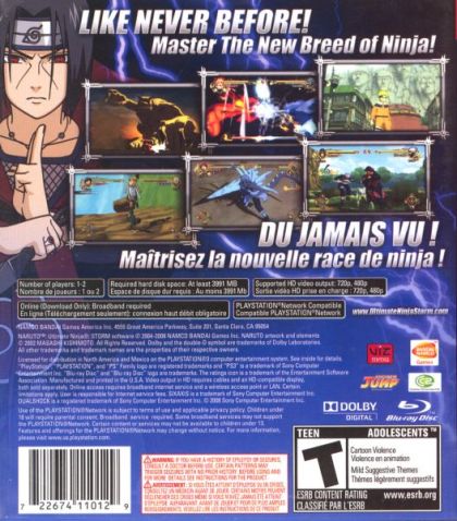 Evolving the head-to-head fighting action of the Ultimate Ninja series, NARUTO: Ultimate Ninja STORM allows players to battle in full 3D across massive environments. Players will unleash powerful jutsu attacks, perform acrobatic evasive maneuvers and even run up walls and over water as they pursue their opponent for ninja supremacy. Players will be able to customize their character's fighting style and recruit up to two support characters to put their own stamp on the action. Each character in the game is capable of unleashing powerful Awakening abilities under certain gameplay conditions, offering new traits and talents to the game's impressive ninja roster of 25 popular characters from the animated series. NARUTO: Ultimate Ninja STORM supports head-to-head multiplayer fighting for up to two players.