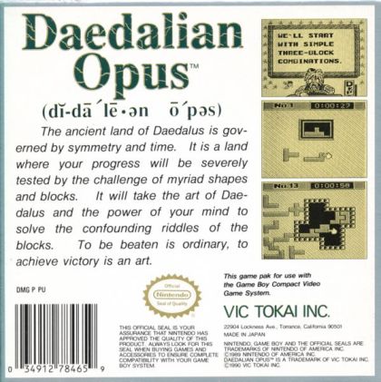 Daedalian Opus is a puzzle game for the Game Boy and was released in June 1990. It was one of the few games produced by the little-known software company Vic Tokai.