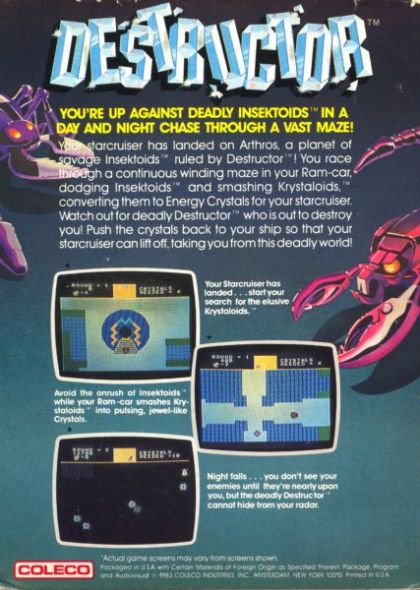 Your starcruiser lands in the hostile city of Araknid to collect precious Crystals needed desperately on earth. Your equipment: the mighty Ram-car. Use your Ram-car to bump Krystaloids, transforming them into precious Crystals! But watch out for the evil Destructor and deadly Insektoids, protectors of the Krystaloids! Can you collect the invaluable jewel-like Crystals and fly home?