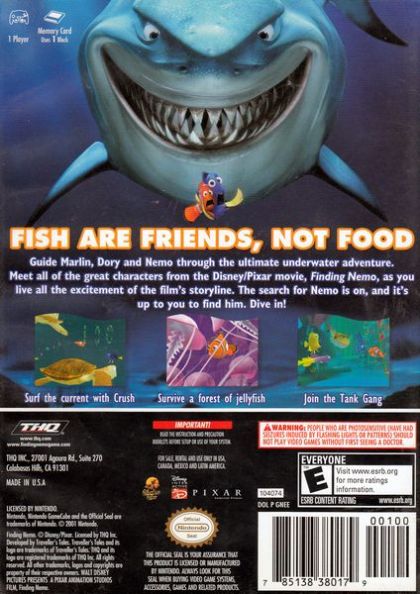 Based loosely on the 2003 animated film, Disney/Pixar's Finding Nemo for Nintendo GameCube features characters, situations, and voice talents of the actor's from the movie. In this aquatic fish tale, players control Nemo, his father Marlin, and the absent-minded Regal Blue Tang fish Dory as they swim through the adventure collecting starfish (to unlock bonus levels) and shells (to increase one's score). Levels are timed, allowing players to focus on improving times, getting higher scores, and playing bonus levels. During the game, the controllable characters encounter a variety of items and power-ups, including bubbles for trapping enemies, bubble (temporary) and red (permanent) rings for speed bursts, krill for protection, sea anemones (temporary invulnerability), and shell rings (shell score boosters). Featured enemies include electric eels, floating spiny sea slugs, hermit crabs, puffer fish, sea urchins, snapping clams, and squishes (jellyfish). Advancement from one level to the next requires meeting a specific goal, but each level also contains special challenges to earn extra starfish to unlock five new bonus levels (Luxo Ball, Pairs, Simon Says, Slide Puzzle, and Teamwork).