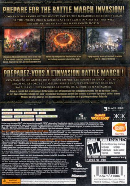 On the Xbox 360, Warhammer: Battle March includes the original content from Warhammer: Mark of Chaos as well as all-new features, intuitive control schemes and support for online play via the Xbox LIVE online entertainment network. Thrusting players into Games Workshop's renowned fantasy world, players will be able to control six unique armies – the Empire, Chaos, Skaven, High Elves as well as the all-new Dark Elf and Orcs & Goblins forces – as they battle for supremacy in a world torn apart by constant warfare. The individual units of each army can be customized in great detail, allowing players to put their own mark on their fighting force and strike fear into their opponents with terrifying combinations of weaponry and armor. Players can also control Heroes and Champions for each army, high-powered units that gain new abilities as they tear through the opposition. Placing the focus of gameplay on combat and tactics rather than tedious resource management, Warhammer: Battle March on the Xbox 360 features two control schemes for both master battlefield tacticians and novice warriors that offer full control over all aspects of the player's army. On Xbox LIVE, up to four players can engage in massive multi-army clashes in head-to-head and team-based modes of play.
