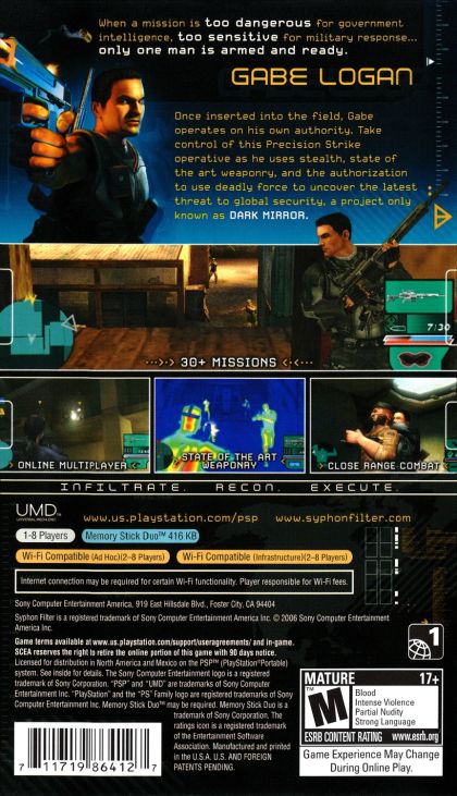 From the development team of the critically acclaimed Syphon Filter franchise, comes their first project exclusive to the PSP system, set to deliver an intense, edge of your seat thriller. An immersive single-player experience that also delivers an evolving online multiplayer experience, Syphon Filter: Dark Mirror features melee attacks, target lock, precision aiming, target and vision enhancements, enhanced artificial intelligence (AI), and high-tech weaponry. Gamers can choose between difficulty modes that monitor and adjust skill level, nine unique online maps using both Ad Hoc and Infrastructure connectivity, and four types of gameplay modes in multiplayer.