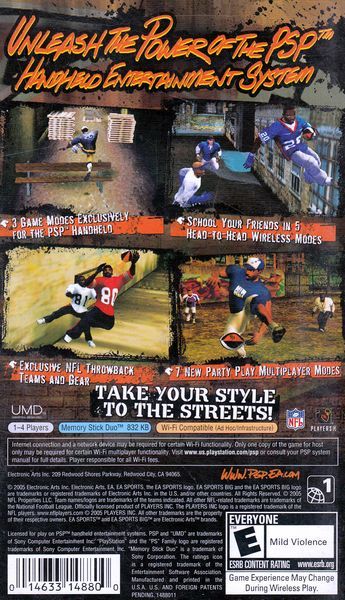 Defy gravity and stretch the world of arcade football to the skies with NFL Street 2: Unleashed. NFL players are free from their real-world constraints to dominate the streets one stylin' move and one field at a time. Raise your game to the limits with up-the-wall passes, off-the-wall catches, and highlight-reel wall jukes that are sure to solidify your place as football's greatest urban legend. With New Exclusive STREET Events, head-to-head wireless gameplay, NFL superstars and legends playing both sides of the ball, and new PSP-specific content, the time to own the streets is NOW.