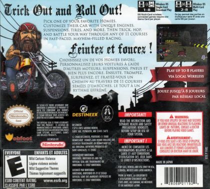 The wildly popular Homies characters take to the streets and in their favorite pimped-out rides in Homie Rollerz, a fast-paced, mayhem laden kart racer for your Nintendo DS! The core play mechanic of Homie Rollerz is "Pimp Out and Roll Out": Pimp out your engine for more horsepower, jack up your hydraulics for more bounce, and trick out your car with spoilers and paint jobs for the edge and style you'll need to be the best racer on the street!