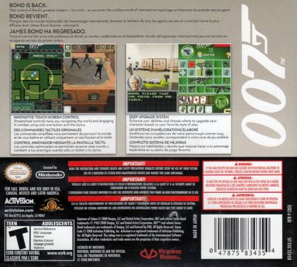 James Bond is back to settle the score in the Quantum of Solace game. Introducing a more lethal and cunningly efficient Bond, the game blends intense first-person action with a unique third-person cover combat system that allows players to truly feel what it is like to be the ultimate secret agent as they use their stealth, precision shooting and lethal combat skills to progress through missions. Seamlessly blending the heart-pounding action and excitement of the upcoming "Quantum of Solace" feature film with the "Casino Royale" movie, the title propels players into the cinematic experience of international espionage. Based on the renowned Call of Duty 4: Modern Warfare game engine that has been specifically engineered to immerse players in the Bond universe, the Quantum of Solace game delivers superior high-definition graphics, reactive AI and visually stunning locations inspired by locales portrayed in the films.