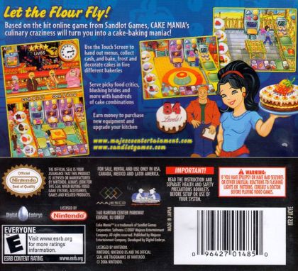 Based on the hit online game from Sandlot Games, Cake Mania for the Nintendo DS translates this fast-paced culinary crisis into the perfect Touch Screen experience. Wait for customer requests, bake their cakes, ice and decorate them, then hand them out and collect your cash. Serve up seasonal confectionary delights to a variety of customers and see if you have what it takes to save the Evans' Bakery!