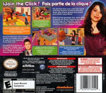 In iCarly 2: iJoin The Click!, the adventure starts with the player as a newbie student at Ridgeway who begins to hang out with Carly, Sam and Freddie at locations from the show, such as Groovie Smoothie, the Pacific Place Mall, and even Carly's apartment. While exploring the locations and interacting with the cast, players get to compete in a series of fun challenges and mini-games to help out the gang. Carly wants her webisodes to become an even bigger sensation, so they need the player's help in LIVE in 5! Mode by choosing props for the set, adjusting the crew, and making sure the show goes off without a hitch. For those with a Nintendo DSi, the game takes advantage of the system's built-in camera to let the player take shots and import images to customize her look and wardrobe in true iCarly style.