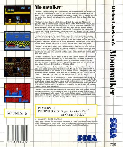 "Michael!" Katy's voice rings out - you've found her! But more children are still lost! Can you stop the psycho mastermind Mr. Big and his goon squad before they kidnap all the kids? You can, if you're Michael Jackson! Moonwalk on muggers, lean on meanies, and pop the punks! Outfight, outjump, outdance! Move like only Michael can, to the beat of Smooth Criminal, Beat it, Billie Jean, and Bad! No bad guy can last through Michael's Star Magic! Punch down gangsters in Club 30. Rumble in the streets. Swing, spin, and kick past graveyard ghouls. Chill in the caverns, then sizzle 'em with ultra-tech weapons in Mr. Big's hideout. Experience the baddest video game ever. Defy physics with Michael's dancing! You never lose your cool. See it and be it - Michael Jackson's Moonwalker!