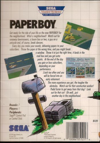 Get ready for the ride of your life as the new PAPERBOY for the neighborhood. What a neighborhood! Watch out for runaway lawnmowers, a boom box or two, a guy on a unicycle and, of course, breakdancers. Every day you make the rounds, delivering papers to your subscribers. Throw the paper at the wrong time, and you might break a window. Throw it at just the right time, it lands in the mailbox and you get extra points. At the end of the day you gain or lose subscribers, depending on your performance. Crash too often and you will be forced into an early retirement. The more experience you get, the tougher the obstacles. Watch out for that construction worker! Pedal faster to get away from that dog! Look out for that car! Oh well... just another day in the neighborhood.