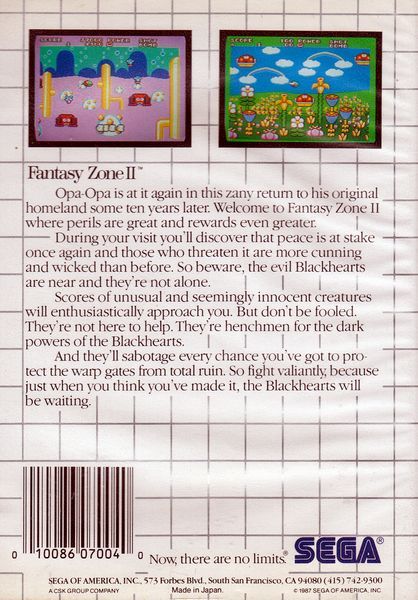 Opa-Opa is at it again in this zany return to his original homeland some ten years later. Welcome to Fantasy Zone II where perils are great and rewards even greater. During your visit you'll discover that peace is at stake once again and those who threaten it are more cunning and wicked than before. So beware, the evil Blackhearts are near and they're not alone. Scores of unusual and seemingly innocent creatures will enthusiastically approach you. But don't be fooled. They're not here to help. They're henchmen for the dark powers of the Blackhearts. And they'll sabotage every chance you've got to protect the warp gates from total ruin. So fight valiantly, because just when you think you've made it, the Blackhearts will be waiting.