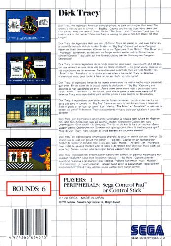 Calling Dick Tracy! Calling Dick Tracy! The mob's got the city by the throat! The next move's yours. You've got to grapple with the meanest guys around and break this crime ring before it breaks you! You've got pistols, machine guns, dynamite fists, and the law. The mob's got Molotov cocktails, a trainload of nitro and bad intentions. Shoot it out with the likes of Lips Manlis, Flattop, The Brow, and Pruneface. Hang onto the side of a speeding car in frenzied street gunbattles. Blast'em in alleys, railyards, and warehouses. Hit the right targets on the gun range and get more time to fight. Clean up the town's seamy side. Then rip into the racketeers at the Ritz. Blast your way to the final showdown with Big Boy Caprice. Think you're tough? Here's your chance to prove it, Dick Tracy.
