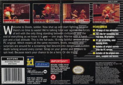 id Software's follow-up to their genre-defining Wolfenstein 3D, DOOM is another first person shooter: full-on action seen from the space marine's perspective. Like Wolfenstein, the game consists of distinct episodes, playable in any order. The first episode, Knee-Deep in the Dead, takes place in the Phobos base and is freely available as shareware. The full game continues on Deimos in The Shores of Hell and culminates in Inferno, the final episode which takes place in Hell itself. Each episode consists of nine levels, one of which is a hidden level.