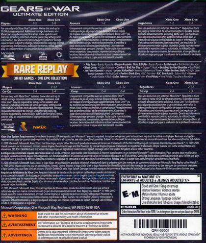 GEARS OF WAR - Own Xbox One Gears of War: Ultimate Edition and experience the original Gears of War rebuilt from the ground up in 1080p, including 60FPS competitive multiplayer with 19 maps and six game modes, and five campaign chapters never released on console. And for a limited time, when you play Gears of War: Ultimate Edition on Xbox Live, you’ll get the entire Xbox 360 Gears of War collection to play on Xbox One at no additional cost. Gears of War: Ultimate Edition is also your ticket to the Gears of War 4 Beta. This is the first Gears at its best – a bundle for veterans of the series and newcomers alike. RARE REPLAY - To celebrate its 30th anniversary, Rare brings together the adventures of its iconic characters in a collection that spans the decades. From its earliest 2D classics to Xbox 360 triumphs, Rare Replay delivers a gaming treasure trove for veteran players and newcomers alike. As you brawl with the Battletoads, grab Jiggies in Banjo-Kazooie and fight the future in Perfect Dark, you’ll uncover bonus content and exclusive looks at the creation of Rare Replay’s hits. Master the basics or test your skills with all-new snapshot challenges and 10,000 Gamerscore. Gaming’s greatest are back, lovingly presented and exclusively on Xbox One!