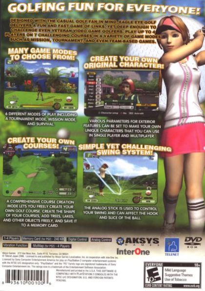Eagle Eye Golf is a different kind of golfing game. It uses a new kind of control scheme that's great for beginners while being flexible enough for pros to use & enjoy. Play alone in a full tournament across multiple links, or challenge your friends with multiple new game options. It's golfing like you've never seen before! Edit and save your own dream course using the comprehensive course designer tools Challenge your friends with your own creation, by trading memory cards