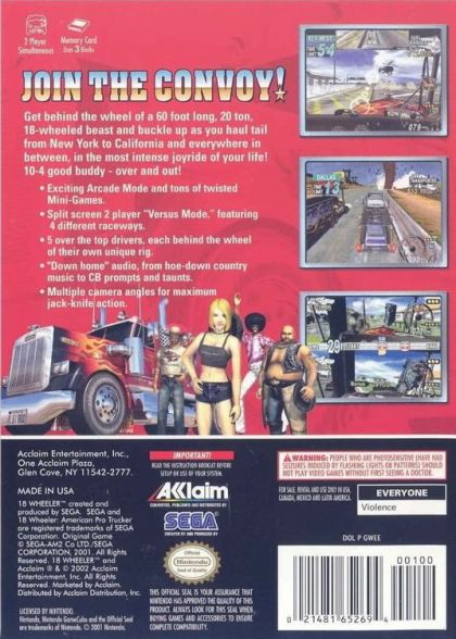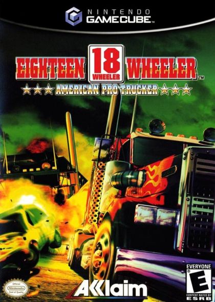 A port of Sega's 2000 coin-op title, 18-Wheeler for GameCube has players hauling cargo across four separate routes while competing against a rival trucker. The four routes consist of New York to Key West, St. Petersburg to Dallas, Dallas to Las Vegas, and Las Vegas to San Francisco. Players race from a view inside the cab of their chosen 18-wheeler, each rated in speed, torque, and toughness, and must reach a series of checkpoints within a time limit to keep on trucking. Points are earned based on three conditions: the time it takes to reach the finish line, the amount of cargo left intact after hitting objects, and whether or not players finished ahead of their rival. Completing the route before the competition unlocks one of three mini-games where players are challenged to park in specially designated areas within a certain amount of time. Finishing the objective reveals a horn, muffler, or engine to boost an 18-wheeler's performance. As in the arcade game, each course features branching paths and fantasy elements such as a swirling tornado making its way across the highway. Other game modes include Parking Mode, Score Attack, and Versus Mode. Parking offers a series of five additional parking challenges, Score Attack involves racing on four three-lap tracks for points, while Versus is a two-player competition on a split screen. A total of five difficulty levels are available to customize the challenge.