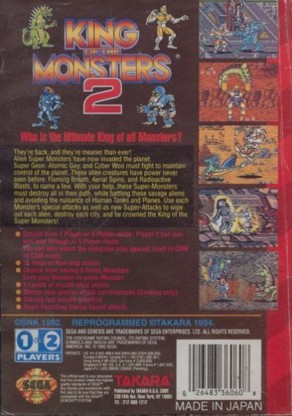 King of the Monsters 2 on the Sega Genesis is a slightly different game than the original Neo Geo version. While the original let you play one of three different monsters to go through side-scrolling beat'em-up stages and fight (non-playable) monster as boss enemies, the Genesis version was re-worked into a one-on-one fighter similar to the first King of the Monsters game.