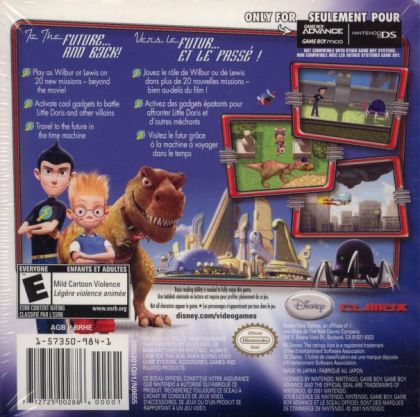 Exclusively developed for the Game Boy Advance, the Climax Entertainment game features a completely different storyline and uses a mix of side-scrolling, top-view, and flying levels (for the Time Machine) throughout. Both Wilbur and Lewis are able to create and activate several different inventions by finding invention pieces throughout the levels. In addition, InventCo Egg-Timers and Gift Boxes are hidden throughout; collecting enough of these will unlock special "Goodies" on the main menu. In addition, a "Battery" meter serves as both a life gauge and a power gauge for the many different inventions.