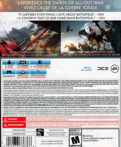 Experience the dawn of all-out war only in Battlefield 1. Fight your way through epic battles ranging from tight urban combat in a besieged French city to the heavily defended mountain forts in the Italian Alps or frantic combats in the deserts of Arabia. Discover a world at war through an adventure-filled campaign, or join in epic multiplayer battles with up to 64 players, and adapt your tactics to the earth-shattering destruction and dynamic weather. Fight as infantry, lead horse charges or take control of amazing vehicles on land, air and sea, from tanks and biplanes to the gigantic Behemoths - some of the largest vehicles in Battlefield history.