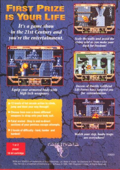 This is a vertical platformer with horizontal wrap-around. For the entertainment of the futuristic masses, you play a criminal that has been inserted into a mechanical body with the promise that if you succeed in surviving through all the levels (there are many and they are hard), you will be set free. You start each level at the bottom, near pooling liquid which will soon rise, at your immediate peril. Navigate the level from bottom to the exit at the top before the liquid rises and kills you. There are many other foes that fly around, causing you damage and basically annoying you to spit. Most levels must be navigated through a series of keyed gates, doors, or portals. These shaped keys are scattered around the map and must by picked up and used only on the gates they match individually. Twist: You can only carry one special weapon (triple shot, laser beam, or vertical shot) and one tool (key, liquid-freeze, or a red herring) at a time. This game requires a lot of memorization of enemy movement patterns and optimum routes. A unique feature is that when you die, you can watch a replay and take over at any point to continue your game. You can also hit the HELP button at the start of each level to view a map, helping you plan your route.