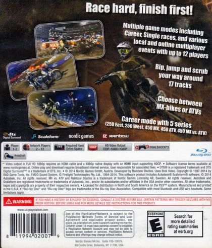 Choose between bikes or ATVs, multiple game modes including Career, Single races, Time Trial, practice and various local and online multiplayer events with up to 12 players.