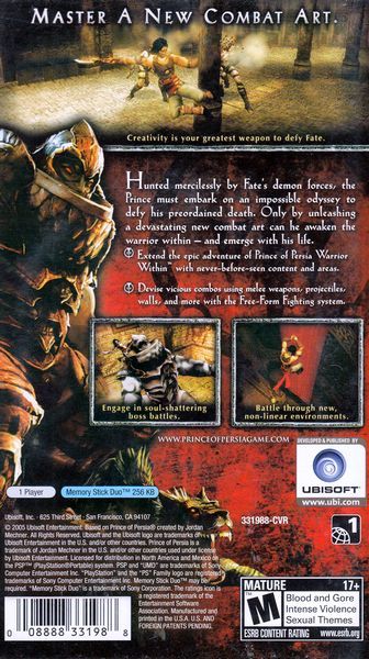 Enter the dark underworld of Prince of Persia PSP (working title). Hunted by the Dahaka, an immortal incarnation of Fate seeking divine retribution, the Prince embarks upon a path of carnage and mystery to defy his preordained death. His journey leads to the infernal core of a cursed island stronghold harboring mankind's greatest fears. Only through grim resolve, bitter defiance and the mastery of deadly new combat arts can the Prince rise to a new level of warriorship ... and emerge from this ultimate trial with his life.