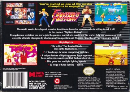 Fighter's History is a traditional 2D fighter along the lines of the Street Fighter series. The player can choose between 9 different characters to play as: Ray, Feilin, Ryoko, Matlok, Samchay, Lee, Mizoguchi, Jean and Marstorius. Two hidden characters, Clown and Karnov, the bosses of the game, are also playable. Each of the fighters have a number of unique moves, once again, fashioned in the image of Street Fighter II.