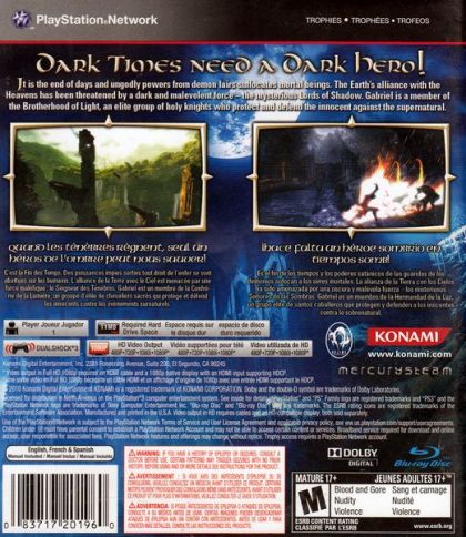 Castlevania: Lords of Shadow takes place at the end of days. The Earth's alliance with the Heavens has been threatened by a dark and malevolent force – the mysterious Lords of Shadow – darkness reigns the world. Across this shattered land, the souls of the dead wander unable to find peace, whilst creatures of evil roam free wreaking chaos and death upon the living.