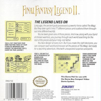 Final Fantasy Legend II, is a role-playing video game developed by Square Co. for the Game Boy handheld console as the second game of their SaGa series. Initially released in December 1990 for Japanese audiences, the game was translated and released in North America in November 1991 by Square America Co, and again in 1998 by Sunsoft. Like its predecessor, the English version was re-branded as a Final Fantasy title due to the series' popularity in the Western territories. The game's development was headed by lead designer Akitoshi Kawazu, who had worked on the previous title, with a music staff consisting of Kenji Ito and Nobuo Uematsu. In 2009, an enhanced remake of the game was announced for the Nintendo DS titled SaGa 2 Hiho Densetsu: Goddess of Destiny featuring three-dimensional graphics, new story elements, and an arranged soundtrack.