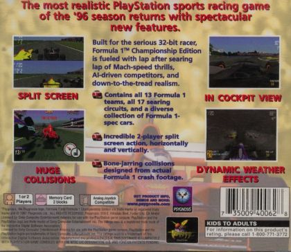 FORMULA 1: Championship Edition continues the FORMULA 1 series' tradition of realism and excellent gameplay. With a full license from the FIA, all of the teams, drivers, and tracks from the F1 season are included. Thanks to the power of the PlayStation, every driver has unique artificial intelligence that recreates the racing style of every driver. For a quick racing fix, you can play the Arcade mode that allows aggressive driving, including bumping opponents and driving off of the track. For true fanatics, play the Grand Prix mode and tackle the challenges of realistic physics and damage. Unlike the previous game, accidents can result in cars being thrown into the air, which gives the game a more realistic look and feel. With all of the action and improvements in FORMULA 1: Championship Edition, F1 racing has never been so realistic.