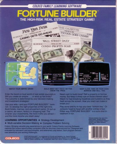 In Fortune Builder(FB) you have five years(thirty minutes of actual time) to build your fortune to $250 million. You have four different skill levels to start at: the harder the skill, the less money you have to start with. At the later levels you are pretty much forced to take out big loans to build up your empire quickly, and the bigger your loans, the higher the interest rates. It's possible to go bankrupt if your net worth drops to zero. In the meantime, though, you need a surprising amount of dexterity and spatial reasoning to keep up with things. The months go by so fast, you know, although not quite enough to be able to play the game in a pinch.