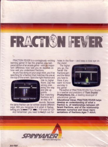 Fraction Fever is an educational video game created by Spinnaker Software in 1984. The TRS-80 version was sold through Radio Shack. The game involves moving a pogo stick laterally on a platform to find a fraction equivalent to the one shown on-screen.