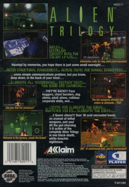 Alien Trilogy is a 3D first-person shooter based on the first three movies in the Alien film series. It was released for the MS-DOS, PlayStation, and Sega Saturn platforms.